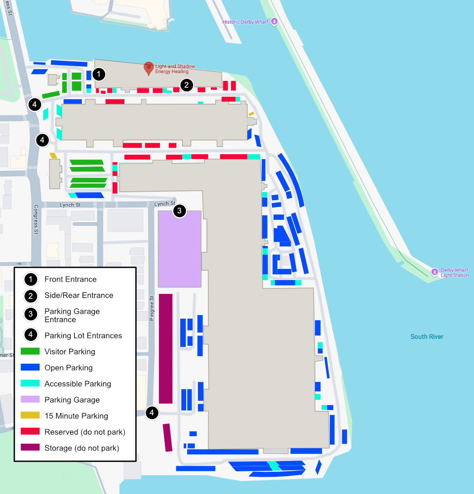 The question everyone asks about Salem, “Where do I park?” One of the reasons Sheltland Park was chosen as an office location is the availability of parking. The office is just over the bridge from Pickering Wharf on Congress street. Please refer to the map for parking. You can park in any green or blue area for free, red and maroon are reserved. There is also a paid parking garage (violet) with an entrance off Lynch St.